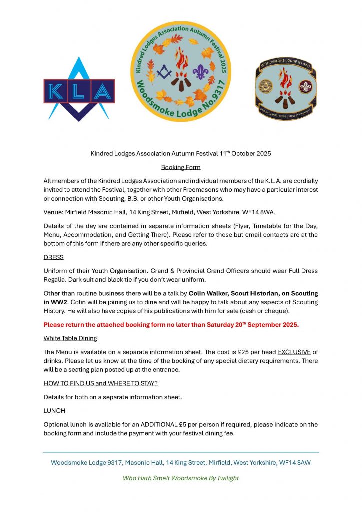 All members of the Kindred Lodges Association and individual members of the K.L.A. are cordially invited to attend the Festival, together with other Freemasons who may have a particular interest or connection with Scouting, B.B. or other Youth Organisations.