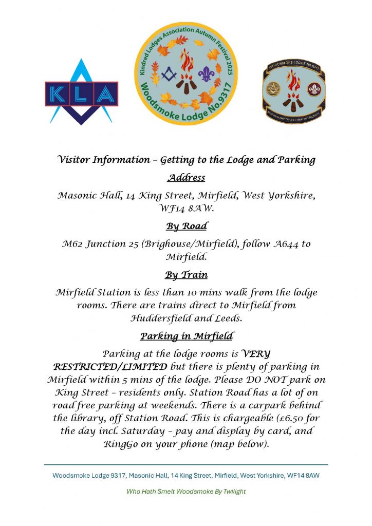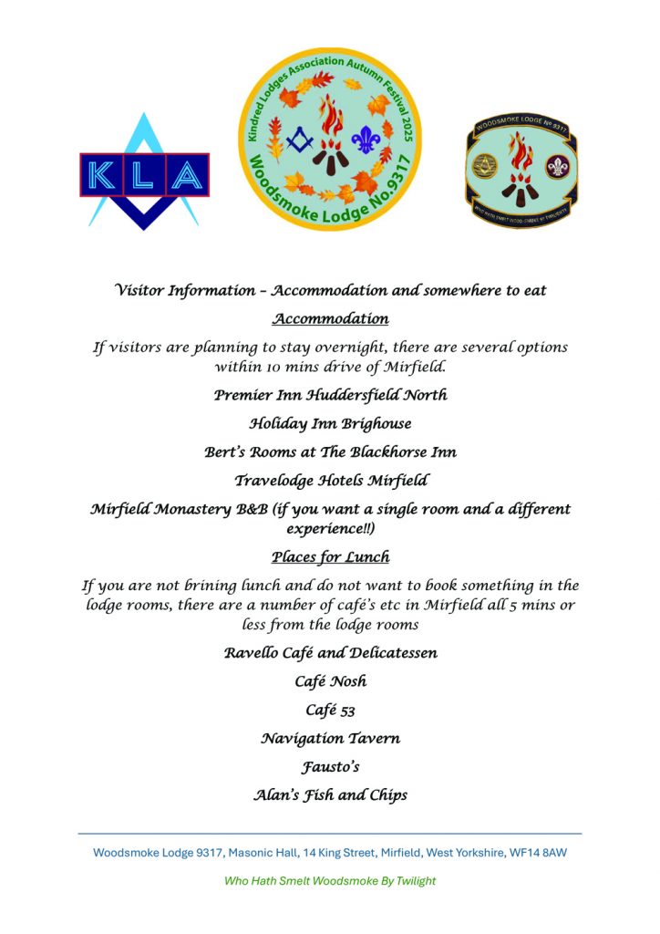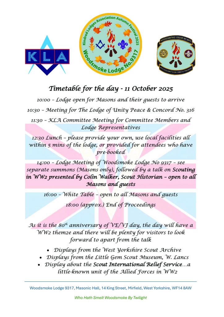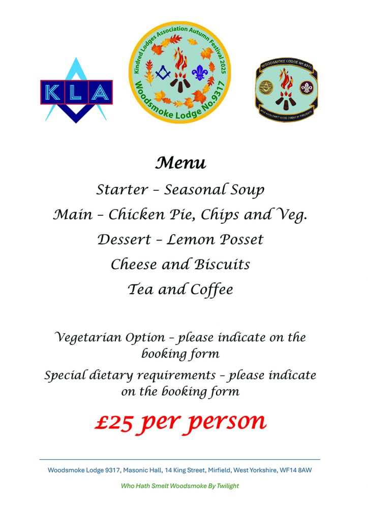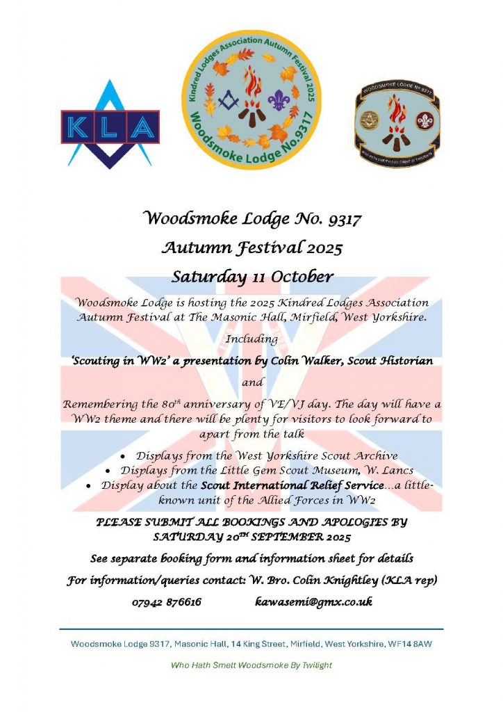 Woodsmoke Lodge No.9317 is hosting the 2025 Kindred Lodges Association Autumn Festival at The Masonic Hall, Mirfield, West Yorkshire on Saturday, 11th October 2025