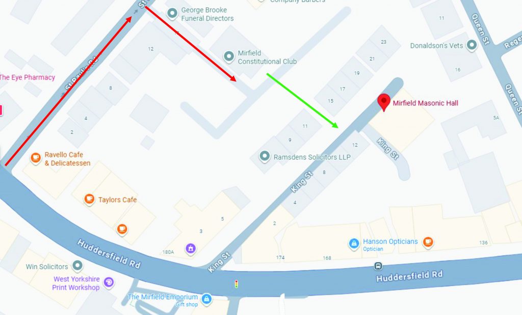 Additional Parking at Mirfield Constitutional Club—St. Paul’s Road, WF 14 8AW. Follow the green arrow to walk through to the lodge.